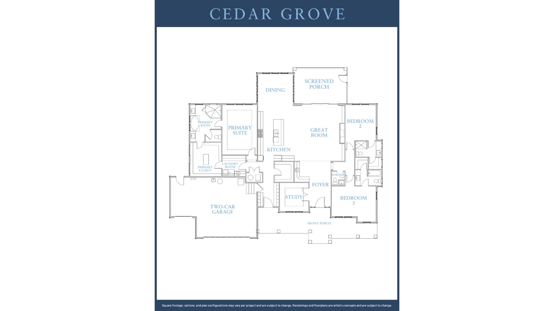 Dimensions, square footage, features, and configuration are subject to modification per build. Renderings and visual aids are the artist’s concepts and may change at any time without notice.